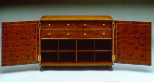 Cabinet designed by William Richard Lethaby and made by A. Thorn for Kenton & Co. Londonca. 1891walnut, walnut veneer, marquetry or palmwood, boxwood and ebony, ivory, brass
