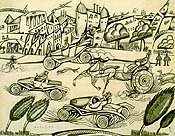 "I do not follow any art schools. The schools are all dead. We, the new ones, seek originality. I am Impressionist, Cubist, Futurist, abstractionist. A little bit of everything." These are the words of Portuguese artist Amadeo de Souza Cardoso in a 1916 interview in the Lisbon newspaper O dia -- and how right he was. Though not widely known, Souza Cardoso was one of the first nonrepresentational artists, and this exhibition at the AXA Gallery (formerly the Equitable Gallery) is the first in the U.S. to focus on his work (the show has previously appeared at the Corcoran Gallery in Washington, D.C. and at the Arts Club of Chicago). The exhibition includes some 31 paintings, 19 works on paper and a smattering of archival materials. Born in northern Portugal in 1887 to a prosperous landowning family, Souza Cardoso moved to Paris to study architecture on his 19th birthday in 1906. He started painting a year later, and by 1910 had become friends with Amedeo Modigliani, exhibiting with him in 1911. Souza Cardoso's circle also included other Modernist pioneers -- Boccioni, Gino Severini and Sonia and Robert Delaunay -- whose sensibilities influenced his work. World War I found Souza Cardoso in Lisbon, where his radical style of painting found little favor. In 1916, he exhibited 114 paintings in a show titled "Abstraction" -- and was physically attacked for his trouble. His short life ended in 1918 in the midst of the influenza epidemic. He was 30 years old. Souza Cardoso's legacy was preserved by his family, and in the 1950s his work was rediscovered in Portugal and across Europe. In the 1980s the Gulbenkian Foundation began acquiring his work, and organized a major retrospective of 262 works in 1987. Though the show declares him a Futurist in its title, Souza Cardoso was a little bit of everything during his brief career. The presentation piece of the exhibition, Don Quixote (1914), is a large-scale painting of a mounted horseman (one of the artist's favorite subjects) composed of curves and discs in brilliant colors. The painting is an impressive synthesis of Delaunay's Orphism, the nature Primitivism of Franz Marc and the colorful Cubism of (early) Francis Picabia and the School of Paris. Souza Cardoso's background in drafting served him well. In a series of ink drawings from 1911-12, viewers can clearly see what was influencing the young artist: The Bath of the Sorceresses features stylized nudes with mask-like faces not unlike those in Picasso's work or Modigliani's drawings. Other drawings, such as The Falcons, are beautifully calligraphic and hint at art nouveau. Bold bright colors are used in nearly every piece, including a series of images of primitive masks. During Souza Cardoso's brief asylum in Portugal, he embraced Synthetic Cubism with a vengeance, and most of his works became jam-packed with abstract and representational motifs. Real Dynamic Arabesque Ocher Red Café Red Singing Zig-Zag Cuirassier Mandolin Metallic Vibrations/Mechanical-Geometric Splendor (1916) -- a bit of Futurist poetry that suggests the latter-day titles of Damien Hirst -- incorporates blocks, splotches and lines of bright color and stenciled letters spelling out nonsense syllables. Coty (1917), a work that some consider the artist's masterpiece, is notable for the extreme disjunction of its collage elements, definitely a proto-postmodernist touch.