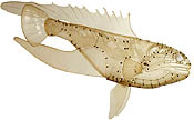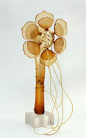 Nature is Bontecou's point of departure for these very formal sculptures. The chrysalis pieces have a rhythmic internal structure and geometric patterning on their carapace-like skins. These pieces recall balsa airplane models, which the artist is said to have enjoyed in youth. Bontecou's flower sculptures look more like floor fans than anything that ever was alive. She makes them by fastening together vacuum-formed plastic shapes and plates. Closely related to the flowers are suspended fish sculptures, which she makes from armor-like plates of vacuum-formed plastic and joins with fasteners.