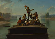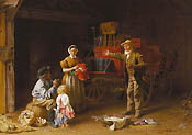 Thomas Wakeman Wood's The Yankee Pedlar(1872) is a pleasing genre scene. The peddler has parked his wagon in the farmer's barn and displays his goods. The husband, who listens to his pitch, has eggs by his side, possibly for use in bargaining, and the wife holds cloth in her hand that she may already have purchased. Their blond-haired little daughter looks on.