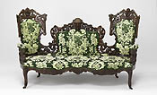 During the Rococo Revival, furniture takes center stage with its dark wood and carved roses, vines, fruit, fish and dog heads. The sofas and chairs become positively orgiastic with ornate shapes, bright-colored upholstery in fancy patterns, lots of dangles and fringes and even cow horns. Still life paintings, some quite lush, hang on the walls of these galleries, as well as Mary Cassatt's After the Bullfight(1873) and works by Elihu Vedder, a symbolist whose work owes much to the Pre-Raphaelites.