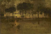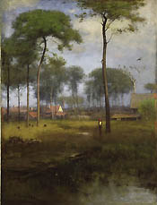 The Art Institute owns George Inness paintings from all periods in his career, including two that he made late in life while he lived in Tarpon Springs, Florida: Early Morning, Tarpon Springs(1892) and Home of the Heron (1893). Both are spiritual, almost valedictory paintings that perfectly render Florida's flat, wet landscape and semi-tropical vegetation. In Early Morning, Tarpon Springs,a lone figure (the artist?) stands in a marshy area with scattered trees and a hawk in the sky behind him. Home of the Heron, a landscape at sunset, hovers between figuration and abstraction. When he made these paintings, Inness surely knew that he did not have much time left. Like the true artist that he was, he challenged himself, produced this work, and in so doing, affirmed life.