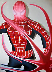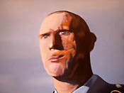The comic-book hero Spider-Man appears twice, Spiderman 1 and Spiderman 2 ("Marvel" is beginning to make sense). Other images include a man in profile talking on a telephone (YGA), a man and a woman climbing a wall of stones (Beginning A), figures with cloth draped over their heads (Spiel 1 and Spiel 2), and a general with a disfigured face (Stage). The images move through the genres of the otherworldly, the familiar, the bizarre and the grotesque with a disengaged precision. Havekost is like a mad psychiatrist flashing cards before his patients to penetrate into their psyches -- all the while keeping a cool complacency.