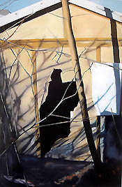 Rusty Landscapes 1-5 (2004), a series of five paintingsgrouped together on the north wall of the gallery, reads like a visual poem to melancholia. Each painting shows a different perspective of the exterior of a house, cropped and composed with further obstructive elements such as narrow tree barks slicing into the foreground. Several are painted under the muted light of a winter sky. Abandonment, isolation, and terror emanate from each work.