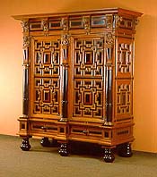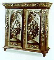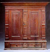 Inside the kast are two or three widely spaced shelves. The more elaborate pieces have a drawer in the base section for additional storage. In the Netherlands the kast was often part of the traditional dowry, and was used to store the voluminous stacks of cleaned and pressed linen required by Dutch households. Colonial wills and probate inventories show that kasten served the same function in colonial America. As in the mother country, Americans placed ceramic vessels on the tops of the kasten for decoration as well as storage. Yorkers were as concerned as Netherlanders with the cleanliness and order in the home. In 1800, Albany was described as "antique, clean and quiet." The doorknockers were scrubbed so thoroughly that they shone "like diamonds." The original Dutch kast is but one variant emerging from the large body of cupboard furniture made throughout western Europe. Early kasten were built of oak and joined by mortise and tenon, similar to the framed paneling found in the houses of the period. Furniture, however, was more likely than paneling to be embellished with extensive carving and a rich combination of ornaments, such as pilasters, cornices, bosses, panels and caryatids. Kasten have become quite popular among collectors of American antiques; one made in New York around 1750 recently sold at Sotheby's for $42,500. A look at a kast from the northern Netherlands at the Cleveland Museum of Art demonstrates the European-made kasten were much more ornate than the American kasten. Made of oak with ebony and rosewood veneers, the Cleveland's kast dates from the second quarter of the 17th century. A period room installed at the Rijksmuseum in Amsterdam has some paneling from 1626 that is stylistically related to it. During the famed Golden Age of the Netherlands during the 17th century, when wealth was flooding into the port cities, the Baroque style developed as a dignified expression of the stature and material success of the prosperous bourgeoisie. Around 1650 the kast form became grander and more opulent, incorporating veneers of exotic woods like rosewood with contrasts of ebony, applied to oak carcasses. The Baroque Kasten were also characterized by monumental proportions and dramatic extensions and indentations that created a play of movement over the entire façade. Especially prominent were the massive door panels, which projected forcefully from the front of the case. The overscale cornice, half-round columns and moldings on these kasten further intensify their dramatic effect. In America, kasten in the Baroque style were made of hardwood. Their facades are similar to their European counterparts, though the methods of construction by local joiners vary -- some are made in one piece as a single unit; others in two pieces with the upper part resting on the base; and still others in three pieces with a detachable cornice. The most blatant difference between the American and Dutch kasten is in the level of craftsmanship. The Amerian kasten were provincial interpretations of the grandiose veneered and carved urban Dutch kasten. The skills and tools of the Americans were simply less sophisticated than those of craftsmen working in the cities of the Netherlands. Kasten were, however, very important household items, and production flourished. But as industrialization gathered speed in America, the Hudson River Valley became increasingly less isolated, and the cultural and practical functions of kasten waned. Gradually kasten ceased to be made. Carefully preserving textiles in cupboards became less important to the 19th-century household when factories began producing inexpensive machine-made yardage of linen and cotton. Changes in architecture lead to built-in cupboards and closets. And as Victorian social mores took hold, it was no longer proper to have a bed in the parlor, so the kast, which was largely used to store bedding, became unnecessary. No longer the vital symbol of a well-ordered household, the kast had come instead to stand for old-fashioned values and Dutch heritage, whose worth was seen as irrelevant in the forward-looking, dynamic young nation. Only a few old Dutch families sought to preserve the vestiges of their early colonial patrimony. It was only when Dutch culture had been totally absorbed into American life in the late 19th century that a new antiquarian interest directed attention to the kast again.