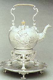A kettle, stand, lamp and salver by Lamerie, dated 1737, is currently on view at the Los Angeles County Museum of Art in the Rosalinde and Arthur Gilbert Collection. Lamerie was born in 1688 in Bois-le-Duc, a town in the Netherlands where his French Huguenot parents were lodging. Along with many other French Huguenots, the family chose to follow William of Orange to England during the Glorious Revolution. In 1703 the 15 year-old boy was apprenticed to Pater Platel, London goldsmith, for a term of seven years. His apprenticeship ended in 1711, and Paul de Lamerie worked on as a journeyman with Platel while he saved money and made arrangements to receive his freedom by service. In 1713 he entered his maker's mark at the Assay Office in Goldsmith's Hall. Living and working within the close-knit Huguenot community in London, Paul de Lamerie took 13 apprentices of his own between 1715 and 1749. He attracted business from both the nobility and the wealthy middle class. Probably his most influential client was Sir Robert Walpole, called "the first British Prime Minister" (1721-42), for whom Lamerie made first the square salver, engraved with the Second Exchequer Seal of George I. A remarkable number of members of Parliament figure among Lamerie's customers. One wonders how many were following the example of the Whig leader. Lamerie had been fortunate in learning his trade from a master of the quality of Platel, one of the most fashionable and skillful interpreters of the French Régence style, with its well-proportioned forms, balanced ornament and architectural motifs, the designs often based on engraved illustrations by Daniel Marot. Lamerie was fortunate in living and working in the French Protestant refugee community with its own cultural identity and where conversation was still mainly conducted in French. He was able to mix with artists in other fields besides silversmithing, and he proved to be particularly receptive to the many ideas being exchanged around him. It was this eclecticism as well as his tough attitude to business that marked his success. At the start of his career in his own workshop, the astute Paul de Lamerie had been willing to carry out orders for plate of simple design in the English Queen Anne style to please his more traditional and sober patrons, yet proved perfectly capable of producing really elaborate pieces when the opportunity arose. It was the advent of the Rococo style to which he responded most successfully. The essential characteristic of this style was movement, and the need for novelty and innovation perfectly suited Lamerie as a designer. His workshop produced a vast range of objects and obviously the same casting patterns were in use many times, yet seldom were items made that were identical. Lamerie was at his most inventive on the small scale, especially with coffee pots, from small pear-shaped versions to exceptional examples where the sculptural form and decoration united successfully. Paul de Lamerie's reputation was such that he is the only 18th-century silversmith who is remembered by name rather than just by the style of his silver. The fame of Lamerie, which uniquely survived into the 19th century, probably derived from the bravura and quantity of his Rococo silver. While comparatively immune to direct French influence in his silver, he produced French-style silver of far greater sophistication. His achievement was the development of a particular ornamental style, which used chiefly late Baroque decorative forms to express the freedom and vigor of the new French Rococo style. The full effect of the goldsmith's art became a reality about the time of Lamerie's birth at the end of the 17th century. The immense confidence of the Baroque style swept across Europe largely due to the power of the papacy and the influence of Louis XIV in France. The style was one of grandeur: the ultimate embodiment of the princely state. In almost direct contrast, the Rococo style that followed was the product of peace. In silver, the style was characterized by asymmetry, curves and spontaneity, which were frequently mixed with naturalistic elements. Almost as soon as the Rococo had taken its wayward hold on Europe, a new renaissance was underway. The Neoclassical style, born of an accurate study of the ruins of ancient Greece and Rome, sought to reintroduce the "true principles" of design: those constants which had endured since the ancient world. Beginning in France and swiftly moving to England, an Anglo-French style emerged in the mid-18th century built on the foundation of the Palladian tradition. Silver is a unique medium in the arts. For most of history it has had a value equal to that of coin, and it is infinitely recyclable. As fashions changed, silver was melted down to reemerge in new forms, or if funds ran short silver was converted into coin. Because of its intrinsic value most European centers of production devised a system of assaying silver to determine its purity, subsequently indicating this with a hallmark. These marks frequently provide an accurate method of dating the piece, and even identifying the maker. Thus antique silver is the most reliable barometer of wealth and taste available to the historian. When Lamerie's obituary appeared in the London newspapers following his death in August 1751, he was identified as "an eminent silver worker" who "was particularly famous in making fine ornamental plate, and has been very instrumental in bringing that branch of trade to the perfection it is now in." In 1911, Sir Charles Jackson, the historian of English plate, wrote that "in recent years, examples bearing his mark have been competed for with avidity." Exactly the same could be said today.