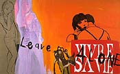 The Bookburners II is a contemporary Judith and Holofernes, in which a bare-breasted woman sits at a table holding a long knife in one hand and a severed head in the other. A wine bottle sits in the middle of the table, and her companion is only visible by his pair of folded arms. In this particular icon to bad love's exhausting cycle of enmity and regret, our Judith seems more sorry than victorious, though she holds her lover's head high.