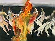 In another painting, titled Fassbinder, a distressed young woman huddles topless in a dark doorway. Wearing black leather pants and holding a lit match between her teeth, she turns her eyes anxiously upwards, like a tormented high-school girl's homage to Elizabeth Wurtzel. On the ground by her feet is a pile of discarded matchsticks.