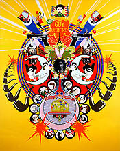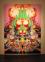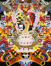 Faunce's large-scale kaleidoscopic canvases of thousands of finely rendered, subtly altered, symmetrically arranged corporate logos, trademarks, pictures of the dead and famous, and a plethora of appropriated images look like psychedelic sea anemones, circus posters, or explosions in the image bank of post-war culture. In Thanks for All the Memories we see a naked J.Lo coming out of a wedding cake surrounded by twin Jessica Simpsons, fighter jets, allegorical figures of Liberty and Justice, oil rigs, surveillance satellites, and a mushroom cloud. It's Dal meets Rosenquist on ornamental amphetamines. Emperor Tomato Ketchup features a cartoon ketchup bottle sitting on a throne in front of the New York Stock Exchange with twin NASDAQ JumboTrons on either side, a Bernini in the background with various Vegas casino billboards, and two Michael Jacksons in Che Guevara berets. These works echo Tibetan mandalas and old rock album covers like Sgt. Pepper's Lonely Hearts Club Band or Cream's Disraeli Gears.