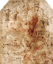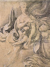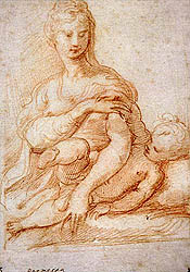 In almost every drawing you can discern Parmigianino seeing, thinking, and riffing. His art is a balancing act of conflicting affinities and drives. He'll turn a child into a paisley shape, a figure into a sensuous curve, or hair into a microcosm. He loves picturing the same thing from different angles on the same page: He'll draw an elongated face, render it in close-up, then from above, then dash off a study of a pouty mouth. In his Venus and Cupid, Parmigianino's she-creature is both observed and imagined, her pose classical yet tarty. She nestles her chin into her armpit, her legs delicately part, and her drapery slips invitingly aside as her left hand arches above her, tickling the mist. Rendered in this febrile hand, she's a randy vision. She also seems to predict the distortion of Tintoretto and El Greco, the rambunctious rhythms of Tiepolo, the sensuality of Boucher and Fragonard, the sweet ennui of Watteau, the aplomb of Manet and many things Ingres and everything Modigliani. In three drawings for his Madonna of the Rose, a sturdy virgin reaches for her tumbling child. Here, as elsewhere, you're enamored of Parmigianino's amazingly finicky touch, his exorbitant imagination, and the sensation that everything is in motion. Wilde remarked centuries later about such art, "Its beauty comes from the fact that the author is what he is."