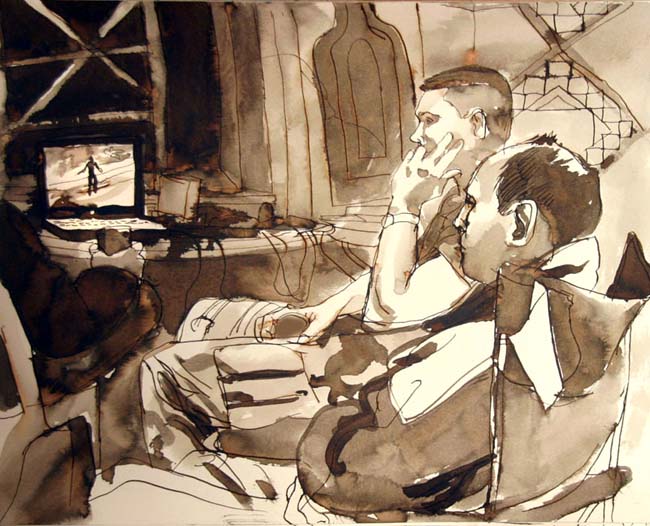 James and Sasha watching Apocalypse Now This movie seemed to have the right mixture of action and irony for soldiers and journalists to both enjoy.On a base rec room you're more likely to see We Were Soldiers.