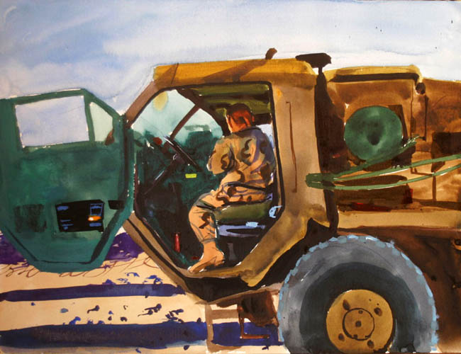 Mechanic working on PLS truck Sgt. Timothy Webb, working on one of the ubiquitous Palate Loading System transport trucks.