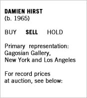 Although Hirst is British and the Art Market Guide is dedicated to American artists, the impulse to include him here is irresistible, so much has he become a vital part of the American art scene. It seems like Hirst has become an overnight success, and in many ways he has. Ever since his much-discussed Gagosian Gallery debut in 1996, Hirst has made his presence felt everywhere from art periodicals to art schools. But it wasn't until 1999 that Hirst began to have a big impact on the art market. Since May of that year, his track record at auction has been exemplary. Then why is Damien Hirst rated a "sell?" Perhaps the following anecdote will shed some light on my theory. In September 2000, a one-quarter page advertisement appeared in The New York Times, offering limited edition Damien Hirst prints. A closer inspection reveals that these were not "fine art" quality prints but mass-market poster-like editions of 500, with prices starting at $750. What's more, the company offering the prints, Eyestorm.com, further demeaned the work by including the following Hirst quote, "Working with Eyestorm, I can bring artworks to as broad an audience as possible, and offer work at prices which are attainable by more people than ever before." If you read on, you were told that, if you acted quickly, you would receive absolutely FREE, a limited edition print of Hirst posed with a truncated head. The more I read, the more the advertisement sounded like a pitch for a Vegamatic -- be one of the first 50 to call and we'll send you a free Ginzu knife! While some might deem it noble and democratic to offer affordable art to a wide audience, this approach has obvious problems. Not only does it make Hirst seem greedy (the ad pointed out he had just sold a work to Charles Saatchi for $1.5 million), but it also calls into question Hirst's taste. Insiders might say that Hirst is just having fun and making a statement about commerce and nature of the art market -- and that's precisely the problem. Damien Hirst's whole career is established on the premise, "anything to get attention." Hirst's current New York show, on view at Gagosian in Chelsea, can only be described as a carnival. Without seeing it in person, it is almost impossible to imagine the level of extravagance to which the artist has gone. For example, the show includes a gigantic fish tank filled with live tropical fish along with a gynecologist's table and instruments. Also on view is a human skeleton, laid out on a glass cross, with rapidly rotating ping-pong balls held aloft on jets of air serving as eyes. Part of the circus does include one worthwhile effort, a long stainless steel cabinet, whose shelves are lined with 8,000 hand-crafted pills (price: $600,000). Yet, the piece that ultimately convinced me that Hirst's work was all about materials and presentation was a tremendous vertical cabinet filled with anatomical models. On the surface, the cabinet resembles a handsome installation at a local science museum. However, the cabinet was so beautifully fabricated that if you stuck a dozen pineapples (or anything else) inside it, the finished piece would look equally impressive. What's more, right after seeing the Hirst show, I stopped for lunch at the new Hudson Cafeteria. As I looked up from my table, I noticed a tall cabinet that was filled with glass cylinders containing colorful grains -- a display that seemed to make the same point as the cabinet in the Hirst show. The point is that Hirst is a master showman who has the funds to finance elaborate sculptures that are consciously designed to jolt and amuse the viewer. Based on the reactions to his Gagosian show, he succeeded wildly. In fact, the talk of the New York art world has been about Hirst and little else. Any time you get an audience discussing and debating the meaning of your work, you've obviously accomplished something. However, once you get beyond the circus atmosphere that pervaded his show, what are you left with? In this case, it appears to be work that is certainly clever but lacks depth. This may be an unpopular opinion, but I just don't see that Hirst's work is going to look significant 20 years down the road. From a market standpoint, things couldn't be going better. The cover lot at Phillip's November sale, a diptych with actual tropical butterflies attached to the surfaces, sold for a record $750,500. Hirst's circle (pill) paintings, which his assistants paint in their entirety, also did well. While everyone who follows the Hirst market will tell you that the influential Charles Saatchi is one of his biggest collectors, you may wonder who the other buyers are. Given Saatchi's past influence on the market, it's a good bet that he's doing his best to make money on his Hirst investments. There's always a small chance that Saatchi is in it for the long haul, but if he dumps his Hirsts, who'll step in to fill the vacuum and absorb all this expensive work?