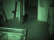 The piece was made at night, while Nauman presumably slept. But before turning in (or getting out of the room), he outfitted his New Mexico studio with microphones and seven surveillance cameras loaded with infrared tape. This apparatus recorded the events of the evening -- in this case, the ambient sounds and nocturnal activities of a bevy of animals, domesticated and not.