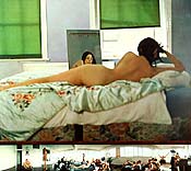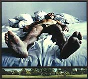 Sam Taylor-Wood, Jan. 22-Feb. 26, 2000, at Matthew Marks Gallery, 522 West 22nd Street and 523 West 24th Street, New York, N.Y. 10011. Sam Taylor-Wood, 32, is a princess charming of the English art scene. Ubiquitous on the social circuit and in fashion magazines, omnipresent in museums and art galleries, in her work she's what a stylist is to a fashion shoot: one who brings together the right hair, clothes and attitude, smoothly coordinating people, places, money and machinery. Taylor-Wood likes to render moments when our inner lives leak out in public. She sometimes electrifies the space between our love and fear of social life. In her double debut at Marks, however, she falters. She confesses to "living a totally aspirational life," but here aspiration gets the best of her. She has become what she beheld: a belle of the new haut monde. But instead of probing this sect, she's dazzled by it. The photographic segment of the exhibition detracts from the video part and makes me think she doesn't know quite what she's doing. Each Soliloquy (as the photos are pretentiously called) repeats a formula. An oversized portrait, inspired by a painting, is set atop a predella, in this case a 360-degree panorama. A naked woman poses as Velázquez's Rokeby Venus, gazing into a foggy mirror; below we see a disconnected office orgy. A naked man echoing Mantegna's dead Christ hovers over an empty lawn. The one of Sue Tilley, Lucian Freud's famously hefty model, positioned above several dwarfs, reduces Taylor-Wood to cheeky name-dropping. Her strength is the florid, luxurious way she portrays a very particular (and, to me, practically unknowable) strata of English social life: the somewhat privileged, vaguely wicked, sybaritic existence of the London bohemian. She's an illustrator of the small but rather extraordinary qualities of being an upwardly mobile English person. But the photographs are contrived. Just because the bottom of the pictures might represent the character's id doesn't mean these things are any better than highbrow perfume ads. If you're familiar with this milieu, however, or prone to party anxiety, her ambitious video, Third Party, may set the hairs on the back of your neck on end. It has no metaphysic, no deeper meaning, so to describe it is to know it. Seven variously sized projected images encircle the darkened gallery, and limn a small crowd of people talking, clinking glasses, being together. Standing in the middle of the room places you at the center of a party that's winding down. Filmed in a continuous 10-minute take, Third Party uses six cameras that are stationary, and a seventh that follows the action. The largest image is of '60s icon and party goddess Marianne Faithfull, who majestically surveys the scene from a leather club chair. Another is a still life of an ashtray, wineglasses and beer cans -- the unofficial logo of current artistic life in Britain. In another we see a lissome girl dancing alone. At the opening, people kept saying, "Oh, that's Pauline, who works at Sadie's. She's Gary's muse," and I found myself feeling out of it the way I sometimes do at art parties in London, thinking, "Gary's muse?" Many say Third Party is Faithfull's story: mythic symbol of excess, now triumphant. I think the primary narrative unfolds across the room, between three characters. The first is one of those semistylish, slightly puffy, sort of smarmy, well-bred English charmers. The sort you might approach and pour your ideas out to, after which he might deign to say, "Do you think so?" He strikes up a flirtation with a not-quite-young woman wearing a low-cut black dress in the adjoining image. After a moment he reaches into her frame to light her cigarette. It's seductive and erotic. You look around the room, thinking, "Did anyone see what I just saw?" Faithfull has, but so has an intense-looking bearded guy on a nearby couch, who stares at the would-be couple. When I first walked in, I unconsciously thought he seemed creepy and out of place. Then he does something that endears him to us. He looks at his watch, but as he does, he fingers a wedding band. "Oh-oh," I thought, and turned around and, sure enough, the female flirt is wearing the same ring. Taylor-Wood says she thinks the audience will, like her, identify with the all-knowing, all-seeing, been-there-done-that Faithfull. Would that we were all so secure. Those who have felt inept in public, however, might also identify with the isolated bearded guy. He doesn't fit in here and he knows it. After a few torturous minutes, he gets up, crosses the room, and stands too near the dancing muse, who ignores him. Faux pas mount, slights accrue. He returns to his roost on the couch. Now he's seething. Snippets of dialogue drift tantalizingly in and out of audibility. Suddenly I caught the duo uttering the word sex several times. I shot a look over to the bearded guy who has to do something before he disintegrates from anger and humiliation. He puts on his coat, then sits back down, another blunder that says, "I want to leave but I can't." He gets up, walks over to the couple, and brusquely says something to the woman. After an I-don't-give-a-shit glance, she responds with the words of someone who's content to someone who's not: "Five minutes." Shattered, chagrined, powerless, he slinks back to his solitary perch. The rake looks over to the bearded bloke, who is now glaring, muttering to himself. The woman picks up the flirtation. Faithfull contemplates. The muse dances on, and that's where it ends, only to begin anew. Taylor-Wood captures it all; everything is high production and visual seduction. Lacking is a certain depth, discomfiture, critical distance or imagination. She wants to deal with deeper social structures, but she's enraptured by appearances. As with Flaubert's characters, extreme states of being lurk just beneath the surface of her situations. She needs to reach for them.