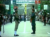 Before long, soldiers appear on both sides of the barrier. Outfitted in multicolored bandannas and elaborate feathered headgear, festooned with ribbons and metals, and armed with swords and looks that could kill, they have the demeanor of agitated, exotic birds. One by one, in a rigid, intimidating, angular fashion, each soldier swiftly high-steps the 20 feet or so to the metal gate. With each stride, the foot is kicked above the head, then jerked down at the knee. The boot comes crashing to the ground. The soldier then jerks his head, grimaces toward the other side, and lets out a huff. This insane display of alpha male behavior is riveting, menacing and comical. Each soldier stops just short of a 12-inch-wide white line painted on the street that runs between the border. This ritual unfolds on both sides of the fence. At first you think the two countries have choreographed it, but the tension tells you this exhibition is more ominous. Each side is sending the same message to the other: Back off and keep out! It's a performance from hell -- history played out by grim-faced, resplendent demons. That both crowds applaud makes this ceremony all the more diabolical and tragic.