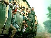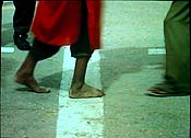 Although the film gets muddled, the sense of deadlock, spite and violence is multiplied and enacted in many other scenes of A Season Outside. Just before the soldier sequence, we're shown feet approaching each other from either side of the border. One after the other, these feet come toe-to-toe, almost pushing against one other, as if fighting. Then the camera pans up and you see Pakistani workers clad in red and Indian ones in blue, passing huge bundles to one another from atop their heads. As with the soldiers, these men are working in perfect harmony to stay worlds apart. It's chilling and mesmerizing. Kanwar, in a haunting voice-over, utters charged phrases like "spectacles of bravado," "Every move is always watched," and "The boundaries of your division begin to smell like a putrefying corpse." It's Barbara Kruger meets Mahatma Gandhi.