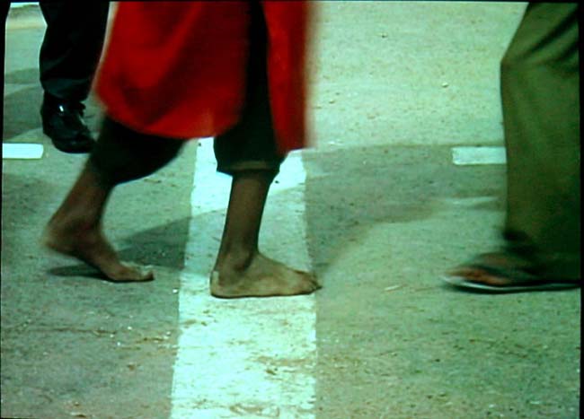 Laborers meeting at the border line to transfer goods across