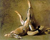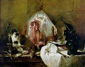 Jean-Baptiste-Siméon Chardin -- always and only referred to simply as Chardin -- has one of the greatest last names in the history of art. It fills the mouth with this wonderful, rhythmic sensation, rolls off the tongue, a combination of charm and garden, then takes a floral turn into a singsongy incantation: Chardin. And his art is as resonant as his name. Lately, there's a lot of reverence toward the supposed purity of Chardin. Words like miraculous, mysterious, silence and serenity crop up. Proust and Matisse loved him; a wonder-struck Diderot, in mock suspicion, observed that no one had actually ever seen Chardin paint. Even theory guys like Michael Fried, Norman Bryson, Michael Baxandall, and Thomas Crow venerate him. Indeed, you can find yourself thinking, this is the best copper pot I've ever seen -- the best glass of water, or sheen on a plum. "The Good Chardin," as he is often called, was born in 1699 to a cabinetmaker. He spent nearly his entire life in his birth city of Paris. There, unfortunately, he went to the lesser local art school, Académie de Saint-Luc. Worse, he excelled not in history painting, but still lifes and genre scenes. It was like wanting to be a great postcard photographer. But Chardin bloomed early and flowered long. In a once-in-an-eon move, the all-important Académie Royale de Peinture et de Sculpture accepted him the same day he applied for membership, at the age of 29. For 19 years he oversaw the hanging of their salons and exhibited regularly in those shows. He was held in high esteem, made good money and died at the age of 80. Not bad for a still life/genre painter. The eight-room exhibition at the Metropolitan is great; it's just not all great. Chardin can be repetitious and boring; his space can get cramped and dark. When he ventures into allegory, as he does in several paintings here, things get hollow. You wonder if you'd even notice a few of these paintings if they were hanging amid the collection of some fancy château. The components of Chardin's art are cups and crockery; fruit, dead rabbits and more rabbits; people preoccupied, suspended between moments; time slowed down to something like a standstill; an infinite variety of browns, ambers and rust; a dry, inexplicable touch. In the words of the French poet Francis Ponge, what sends people about Chardin is the way his "least pretentious still life is a metaphysical landscape. Time flows, and yet nothing ever happens." A classic passive, Chardin is an out-of-sight, out-of-mind artist, very hit-and-miss. His touch is never aggressive or insistent, unlike Rembrandt's, though the painters are often compared. His color isn't as gorgeous, or his light as spellbinding as Vermeer's, and he lacks the emotional depth of Watteau. However, when you do alight on a Chardin that does it to you, it really does it. I melted in front of the best basket of wild strawberries I've ever seen. Chardin can make you experience the utter simplicity of it all, and provide an absolute affirmation of life's little joys. At the same time, his paintings of death, and there are many, make death exquisitely, hypnotically visual, never cruel. Coming upon one of his dead hares at the Met is like discovering an animal carcass in the woods: startling and intriguing. Chardin completely invades the privacy of death. You gaze at his rabbits, partridges, thrushes or ducks in ways you could never look at a dead person. It's so voyeuristic and intimate it takes your breath away. You linger over matted, molding fur; trace a bullet wound, a trickle of blood with your eyes; note rigor mortis setting in; and weigh the physicalness of death. The best of these pictures make you feel the heartbreak of death and the staggering beauty of life simultaneously -- what Ponge called the "meritorious ground between peacefulness and fatality." The painting that got Chardin into the Royal Academy, The Ray (1728), is wild and overrun with stuff, but you can already see his feeling for light, his lack of fussiness and the maniacal Babette's Feast attention he lavishes on food and cooking utensils. There's a casserole, jug, knife, ladle, vinegar carafe, scallions, a couple of carp, some oysters stalked by a pretty kitty and -- hanging from a chain -- the surreal, Soutine-meets-Ensor ray, the best I've ever seen. Chardin's "formalism" -- the way he constructs his pictures, his color, composition and textures -- makes time spent with his work unlike that spent with almost any other painter. Look at a heart-stopper like Girl with Shuttlecock, in which a young girl stares into space as she gingerly cradles a badminton racket on her hip and rests her hand on a chair. You can get lost in the multicolored feathered shuttlecock, feel the moisture in the interstices between her palm and the wooden chair, savor the succulent olive background and the wrinkles of her billowy dress. The closest thing to looking at a Chardin might be contemplating the almost-monochromes of Ad Reinhardt. At first you think, "Not another one of these"; then you start to see things, or think you do. Tonalities change, the light flickers. You pick up minute shifts in the direction of a brush stroke, an inconsistency of surface. Before long, what started out mundane transforms itself into something ravishing. Unfortunately, there are none of the late pastel self-portraits on hand to humanize Chardin. In the catalogue, they're captivating. At first you think he's in drag, some sort of goofball swami. Outfitted in glasses and bundled in some kind of turban or headdress, he's a strange combination of Ed Wynn, Ben Franklin, Bea Arthur and a kindly uncle. Writers almost always add that Chardin paints love, not sex. As if ardor would soil the purity and the "goodness" of his art. But there's lots of sex in Chardin. It's that tingly, sensuous, voluptuous buzz you feel standing in front of his best work. It's what we mean when we say we love Chardin: he paints our rapturous infatuation with lif