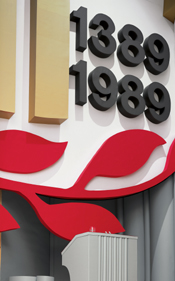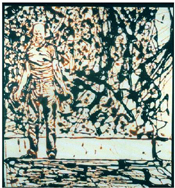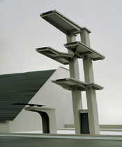 Demands work initially seemed bland. Early on, he favored neutral tones: beiges, grays, lots of brown, black, and white. He made sculptor Tony Smith and painter Ad Reinhart look like colorists. Then, beginning in 1997, what had been scattered highlights -- a yellow coffee mug, a blue folder -- became more prominent: the rear wall in Studio that could compete with color-chart paintings by Ellsworth Kelly; a lush green Lawn the envy of any homeowner; gold Bullion cubes; and even an overpowering red logo in Podium. And Demands lighting became more animated, too. Uniformity has given way to polyphonic rhythms: the play between ceiling and floor in Calculator; the lit-from-behind world map in Mural; the penetrating sun in Clearing. In terms of just his ever evolving formal powers, its not difficult to wonder where Demand is headed.