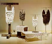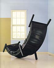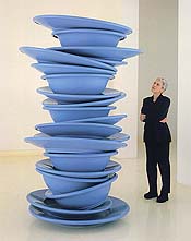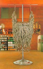 These days, Robert Therrien's downtown studio could double as a costume shop for giants. For one thing, a 15-foot-tall beard made of stainless steel "hair" is hanging by its earpieces from a metal stand. "I thought the beard was an interesting subject because it's a symbol of the artist," Therrien says, by way of explanation. "At one point, one of the models was Brancusi's beard, but I eliminated it because it was the wrong shape. Now it's closer to Rodin's beard. Didn't all the great artists have beards?" The beard of steel, as well as ones made of plaster and plastic, joined some 30 other works created since 1992 in the exhibition "Robert Therrien," Feb. 20-May 7, 2000, at the Los Angeles County Museum of Art. Beards are not the only idiosyncratic elements in an exhibition that includes an impossibly elongated hospital bed coiled into a spiral, oversize blue plates stacked to a height of eight feet, and a massive Dutch door opening into a blank wall. The show also features a table and chairs tall enough for adults to stand under without stooping. LACMA's curator of modern and contemporary art, Lynn Zelevansky, organized the exhibition. "Bob is from a generation in which Conceptualism has had an enormous impact on the production of objects," she says. "There are concepts in the work yet it remains dominantly visual. It's about your body and your perception in relation to these objects, which will work on you physically." Therrien sees the world from a greater-than-normal height. At 53, he stands more than six feet tall. Smoking one cigarette after another, and wearing a habitual hangdog expression, he trains his blue eyes appraisingly on the curves of the beards in his studio. Therrien is nothing if not precise. Since much of his sculptures' impact is based on enlarged scale and verisimilitude, the execution must be exact. Objects in Therrien's world take on a life of their own. As in the animated cartoons that have influenced his work, the quotidian is transformed. Works, like the beards, often look as though they were imported from the animated film Fantasia. "I have an attraction to the animated aspect of a cartoon that really factors into the work," Therrien says. "I think cartoons are part of a lot of people's consciousness. Cartoons have really reductive body parts. They are reduced to the simplest forms. I end up with images like that." In the studio, Therrien opens a storage room door and offers a visitor a view of his collection of magic props and disguises. It is full of rubber noses and plastic ice cubes, parts of toy animals and packaged cotton candy, rubber dolls, fake flowers and an old circus organ. They act as sources of insouciant inspiration. In fact, comic books were Therrien's earliest introduction to art, as they were for many artists of his generation. He made copies of them from an early age. "I drew from comic books," he says, "and thought that I had a style of sorts." A Chicago native, Therrien moved at age nine with his family to Palo Alto, Ca. "I always remember thinking that I was some sort of artist, then becoming obsessive about it as a teenager," he recalls. He attended California College of Arts and Crafts in Oakland from 1968 to 1969 then decided to pursue photography and transferred to Santa Barbara's Brooks Institute from 1970 to 1972. Once enrolled, he found that he was less interested in making fine photographs than in drawing and making sculpture. After he graduated with a bachelor's degree in fine art, he went on to graduate school at the University of Southern California. After earning his master's degree, in 1974 he leased a studio for $150 a month and began to hone the evocative wall reliefs and modestly sized sculptures that first attracted critical attention and exhibitions. "Mostly I stayed in my studio and had a completely normal, quiet work schedule and occasionally sold something to some curious person, enough to keep me going. I was sort of undisturbed during those 10 years. I think it formed strong work habits that I still have, always working at least eight hours, mostly at night." He labored in relative obscurity until 1985, when he was included in the Whitney Biennial and taken on by the late legendary art dealer Leo Castelli (he is now represented by Gagosian gallery). In 1991, when he was given a survey exhibition by the Reina Sofia Museum in Madrid, curator Margit Rowell described the work as "both déjà vu and jamais vu." She referred to his scale as "confidential," which nicely described Therrien's output up to that time -- poetically reductive sculptures and paintings of simple but evocative shapes like snowmen, keyholes and church steeples. Around that time, Therrien said, "What I do doesn't translate into a large scale." Shortly after that, Therrien took a series of photographs of staged tableaux to illustrate The Dream Hospital, a book of poetry by critic John Yau. Some of those photographs inspired the sculpture in the current exhibition. Therrien explains, "His (verbal) imagery pushed the work into the domestic realm a little, with the beds and the plates." Equally important, the return to photography inspired him to work closer to reality and on a monumental scale. "I started using photography as a tool for figuring out ideas," he says. "As a result, the pieces are more recognizable as real objects than before." The beards, for example, meld the hyper-reality of a photograph with the improbable scale of a cartoon. "For some reason, I wanted them to be fake beards, the type of beard in a cartoon image," Therrien says. "A beard from animation can have a life of its own, can start walking around. I end up with images like that." The show travels to SITE Santa Fe, New Mexico (June 17-Sept. 10, 2000), the Houston Contemporary Art Museum (Dec. 16, 2000-Feb. 28, 2001) and the Museo de Arte Contemporaneo Monterrey, Mexico (Mar-June 2001).