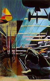 Most of the oil-on-wood panel paintings, and also the video images, were inspired by a museum display at the National Technical Museum in Prague, which she visited a year ago. In each work, Levy uses expressionist brushwork and vivid colors to show an imaginative collision of biological and technological forms and forces. In works such as Damien's Gliders/Agassiz's Chart and Christo's Tusks/Loewy's Propellers, animals and machines seem to crash and fly in frantic motions and counter-motions. Elaborate architectural structures appear caught in a similar state of flux, either exploding, collapsing or disintegrating as a result of some unseen work of nature. The video also deals with the interaction of living beings and machines. In one scene, dueling combatants cavort among the fractured planes of an architectural space based on the design of the Prague museum. Ellen K. Levy, "Shared Premises," Feb. 6-Apr. 8, 2000, at Trans Hudson Gallery, 416 West 13 Street, New York, N.Y. 10014.