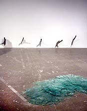 Le Va himself showed his good humor at the gallery walk-through prior to the opening, when a member of the press accidentally crunched some of the floor-strewn glass and the room grew hushed. The artist, clapping his hands, went over and proceeded to crunch some more glass himself, maybe hoping to help the person feel less embarrassed, maybe moved by a spontaneous desire to relive the original creative moment. It was hard to tell.