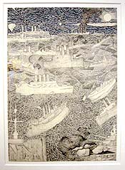 Because so many talented artists have overcome mental and developmental disabilities to create something strange and wonderful and refreshingly different, a number of galleries, like the Henry Boxer Gallery of London, specialize in the works of these visionaries. Dreadnoughts, an ink drawing from 2002 by Nick Blinko (b. 1961), uses tiny cells of ink to conjure a shallow space which his mythic vessels navigate. Blinko is a schizophrenic, who takes medication but cannot work while doing so. He braves his illness to make his art, putting himself at considerable risk and discomfort. The results, as in drawings like Dreadnoughts and in pieces that contain only rows of tiny script with words that do not make linguistic sense, are claustrophobic and utterly haunting.