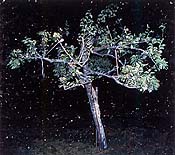 A different direction is explored in an image of a fragile pear tree held upright by a post, its limbs connected by wires. Glowing defiantly against a black background, the tree is illuminated by flashbulbs, like a movie star by paparazzi cameras. The trunk is too feeble to stand alone, but the leaves are fresh. Human hands that train and control their own bodies have tied up the branches of the tree and bent them in forced directions. Doctored to fit arbitrary esthetics by bondage imposed from outside, the tree represents something veiled in the other paintings: endurance through training, unnatural beauty, the living body's decay arrested.