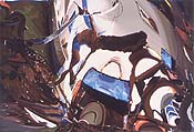 Exercisers often watch themselves in mirrors, keeping an eye on their body's improvement. The distorting mirrors surrounding Krashes' subjects, who are seen working out on home exercise machines, hardly enhance appearances. In the paintings -- done from photographs of staged scenes, sometimes shot with a moving camera -- bodies are fragmented, limbs swell and shrink, melding and separating from objects and backgrounds, becoming monstrous. Gravity no longer applies. A foot is discernable, then a figure and another, perhaps a reflection of the first. Brushstrokes flow across canvases, performing kaleidoscopic arabesques. Icy blues and pinks play off fugitive purples and browns. As shiny mirrored light is rendered with matte oil paint, patches of white canvas give paintings the immediacy of a sketch.