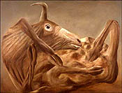 But isn't that what Surrealism -- particularly war-related Surrealism -- is supposed to be? James Gleeson's Funeral Procession in a Wounded Landscape (1945) transforms bodies, trees and hillocks into a Boschian-erotic nightmare. Since Australia oozes with gnarly trees and arid stretches, the scene seemed logical enough, though I couldn't help but wince at the Dali-esque overstatement. .