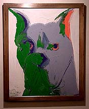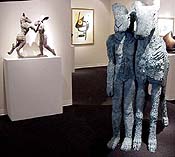 Over at Berkeley Square Gallery from London are the cheerful patinaed bronzes of Sophie Ryder, a British sculptor of dancing and romancing hares and dogs who has a big following in Palm Beach (a major sculpture was bought out of last year's fair for the new Robert & Mary Montgomery Armory Art Center, established by the famed litigator who most recently made news for bringing the tobacco companies to their knees). On view at Berkeley Square is a life-size sculpture of a Standing Lady-Hare with Dog (2000) and a smaller wall piece showing a Pink Lady-Hare Dancing with a Big Brown Dog. Her price range is $30,000 to $100,000.