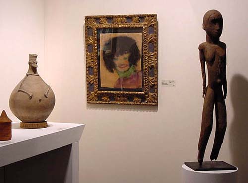 From left, a Wilso Anthropomorphic vessel,a 1920-22 Nolde and a Bateba female figure,at Leonard Hutton Galleries, New York