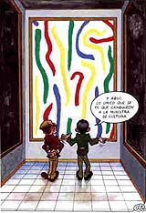 Just for fun One of the cartoons is a direct take-off of a recent Spanish car commercial. In the TV spot, an art-dealer takes a client through an artist's retrospective. The paintings are quite grand, measuring about 18 feet high by 9 feet wide, and all are black on black. The last painting in the show looks something like a Morris Louis gone amuck, and is "awash" with garish colors slipping over each other. The client asks, "What happened here?" The dealer shrugs and replies, "All I know is the artist changed cars." In the cartoon done by Jordi Figueroa Serra of Valls, Spain, when the client looks at the final, colorful painting, the dealer says, "And here, all I know is that they changed the Minister of Culture." With national elections scheduled for Mar. 12, the cartoon could prove to be prophetic, whomever wins the presidency. If Socialist Candidate Joaquín Almunia is elected, the Minister of Culture position is sure to be filled by someone other than the post's current occupant, Mariano Rajoy. On the other hand, given that Rajoy also serves as incumbent President José María Aznar's campaign manager, Rajoy could well move to a different, but equally strategic position in the new cabinet, if Aznar remains for a second term. See you in Madrid!
