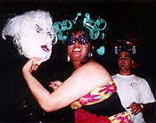 Luckily, I see one of the contemporary shows, "El Santo en Santurce," a multimedia extravaganza that incorporates video, paintings, sound and set designs by an artist collective Laboratorio Cultural. The LC could be described as a raggedy and carnival-like Forcefield. It is composed of Antonio Walker, Jose Luis Vargas, Marcos Ruiz, Ivette Roman, Octavio Rodriguez, Jose Ramirez, Freddie Mercado, Cacheila Soto and Hiram Rios.
