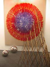 Down on West 23rd, Texas native Michael Phelan set up "Bless You Taco Bell" in the cozy quarters of the back gallery at Daniel Reich. A former Grateful Dead camp follower with a pronounced taste for kitsch modernism, Phelan filled the room with large tie-dyed target paintings that he had had made to order on raw linen ($8,000), plus some stainless steel "memory balls," a Star Wars poster and a steep lattice pyramid of gold-painted branches, called If today was perfect, there would be no need for tomorrow.