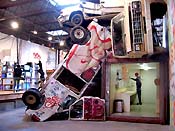 Standing in for artist and dealer both was a gang of mechanical taggers, including a guy in a realistic bathroom tableau set in the back of a tipped-over panel truck and a tower of five graffiti writers (each one standing on the shoulders of the last, to write "Amaze" in red, high up on the wall), plus several animated little tikis with spray cans.