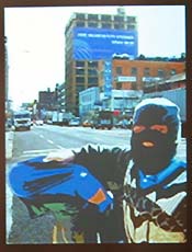 Also at the Proposition is a DVD projection by Grace Graupe-Pillard called "Interventions" that digitally inserts brightly colored images from far-off wars into the everyday streets of New York City. The series of 76 images "attempts to make visually apparent the ongoing tragic repercussions of war in our own backyard."