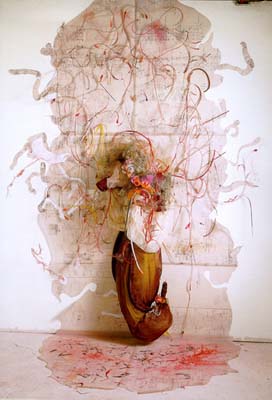 Rina BanerjeeInfectious Migrations from the seriesAn Uncertain Bondage Is Deserved When Threatening Transmission 1999 incense sticks, kumkum, vaseline, turmeric, Indian blouse gauze, fake fingernails and eyelashes, chalk, foam, feathers, fabric, Spanish moss, light bulbs, wax, Silly Putty, quilting pins, plastic tubing, latex and rubber gloves, acrylic and dry pigment dimensions variable.