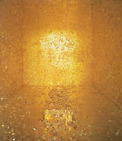 The first New York museum presentation since 1970 of the work of American artist James Lee Byars (1932-97) includes the American premiere of a gold room with a sarcophagus marked with five crystals, part of a 1994 performance in Brussels that the artist called a rehearsal for his own death