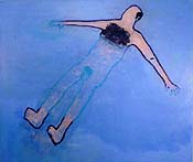 These two sophisticated pieces contrast markedly with Katherine Bradford's oil painting titled Swimmer, Man (2001), which depicts the generic figure of a faceless man floating in a sea of blue. Lacking any particular style, Bradford's work strikes a balance between folk and leisure genres. Sebastiaan Bremer's altered photographs lend three-dimensional forms to the hypnotic effect created by ocean waves. Buoyant (Pool I) and I Held My Breath for 13 Hours (Pool II) (2000) are meticulously patterned with small white dots that delineate and deconstruct stills of aquatic movements.
