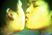 Two additional videos explore the otherwise mundane properties of H2O. The Long Dissolve (1998) by Burt Barr documents an ice cube melting in a clear glass dish. Even though the artist used video techniques to speed up this process, the depicted event is too immediate and does not assert an extraordinarily creative idea beyond the framework of sign and signified. Fountain (1999) by Patty Chang is so much sexier by comparison. Driven by fantasy, a young Asian woman kisses her own mirror reflection as small, subtle ripples drift away from the point of contact.
