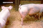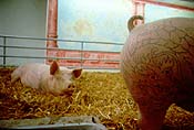 And his continuing project, a herd of pigs covered with tattoos done by the best needle-men Antwerp's red-light district has to offer, is currently appearing at venues around the globe. Marcel, a pig adorned with a Harley-Davidson tattoo, has visited several European cities, while Bonnie and Clyde spent last Thanksgiving at the San Francisco Art Institute and Boris and Tatiana went to the Moscow Art Fair. The artist also makes stuffed tattooed pigs (one sold at auction in 1998 for $12,500) and tattooed pig skins ($4,830 in 1999). Delvoye lives and works in Ghent.