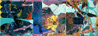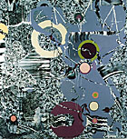 Her art is an improvisational accumulation of fantastically involved and involving details, and yet she has an ability to juggle detail and totality without subserving one to the other. And there is just as much spatial complexity as in the earlier works. If anything the newfound harmony that predominates heightens the irregularity of lesions when they do appear. Instead of the violently conflicting blocks of color of the 1994 triptychs, the canvases are filled out with a black and white moiré effect. Equilibrium is achieved more through dissonance than assonance, to be sure, but the dissonance is all the more compelling for being within a given scale (12 tone rather than diatonic, to pursue the analogy) and achieved by forces that work together. Now compositions are radically decentered rather than just bloody-mindedly all over the place.