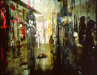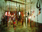 A couple of the best hanging net tubes expand like cells into nuclei separated by thinner segments where you see only the net. The nuclei, seen through the net, are made of groups of rag dolls or indiscernible blobs. Here and there on the floor are gatherings of stuffed chickens, a rabbit, etc., posed as if they are eating peacefully. Nearby a stuffed fox dressed in billowing tulle seems to have stepped out of a fairy tale, and you realize another important mood-setting influence. Messager does not use sex or violence to make her pieces catch the viewer's eye -- but she does catch it, and once she has it she effectively hypnotizes you.