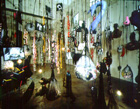 As you walk you see lots of vertical paths your eye can follow. Some are twisted tubes of netting filled with things at irregular intervals, some are vertical rows of photographs hanging down, some are stuffed fabric words, each letter sewn to the next, hanging from ceiling to floor. A group of these vertical "lines" may stop at the same height (and they may be tinted the same color) so your eye wonders horizontally. Peering through the forest of verticals in any direction, you find unexpected and delightful art oases. Even as you focus on some of these, you are aware of the others that surround you.