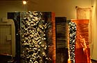 The intimacy of the works in this room contrasts with the theatricality of the enormous sculptures that dominate the show. One of the exhibition's spectacular installation pieces is titled Palindrome Incest (1990) -- perhaps Tunga's best known work. It results from the artist's study of topology, and also seems to refer to strip mining in the Amazon forests. In this work, several huge iron cauldrons, about five feet high, are wrapped in hundreds of strands of thin copper wire hanging from the ceiling in elegant swags. The wire connects the vessels on opposite sides of the room, transforming them into gigantic magnets. Some of them are covered with a layer of furry-looking, magnetized iron filings, and one bears a layer of small sheets of pinkish gold colored copper leaf, which flutters in even the slightest breeze.