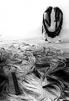 Also during the opening two identical twin girls, dressed alike and with long flowing hair, strolled leisurely through the galleries. The girls wore an elaborate wig, connected to each other by long stands of hair. This image -- of Siamese twin girls joined at the hair -- is a recurring one in Tunga's art. The twin girls are featured prominently in an astonishing video titled The Silver Nerve (1987), which was showing continuously in the museum's video room. In the video, the girls stroll through what looks like a deserted factory.