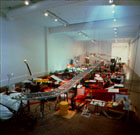 Jason Rhoades' open studio, manifested as well at David Zwirner gallery downtown, tells us that any four walls can do. It's the accumulation of things, all over, all put to use, that makes a habitat. Architecture is not something to look at; rather, it's something in which you live and work. Thus the "untutored" viewer's reaction to Rhoades' piece: "Hey, I have one of those, and one of those, and one of those...," as if the guy's showing off everything he owns to his friends.