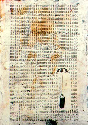 typed text, liquid paper, pen on postcard